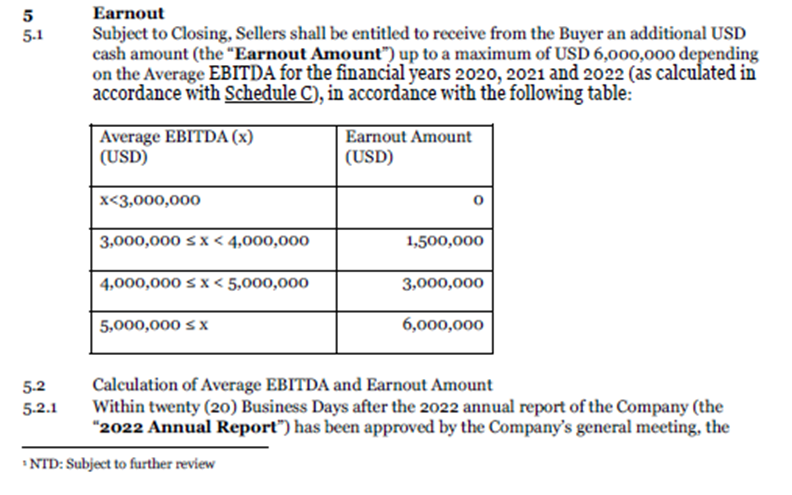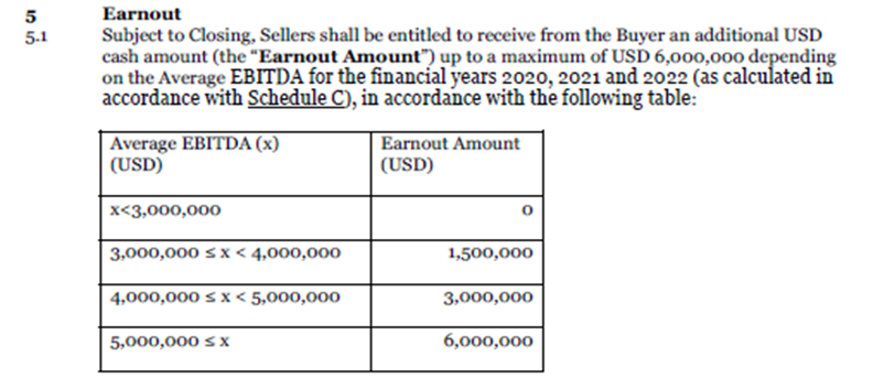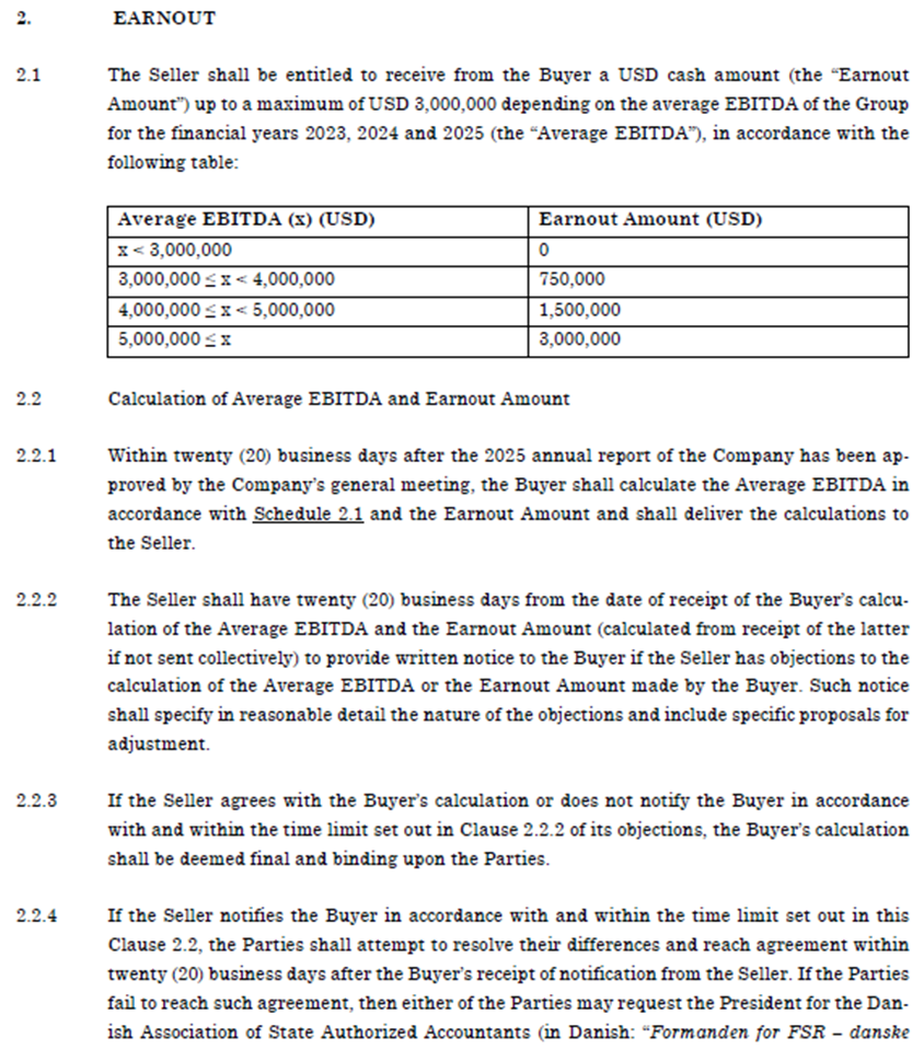 Den pågældende earnout er reguleret i pkt. 5 i Overdragelsesaftalen. Spørger og D LLC var herefter berettiget til et yderligere kontantbeløb ("Earnouten") på op til […] USD afhængigt af A ApS' og dets datterselskabers gennemsnitlige EBITDA over de 3 år 2020, 2021 og 2022. Med andre ord afhang denne "earnout" af […] i de pågældende år.