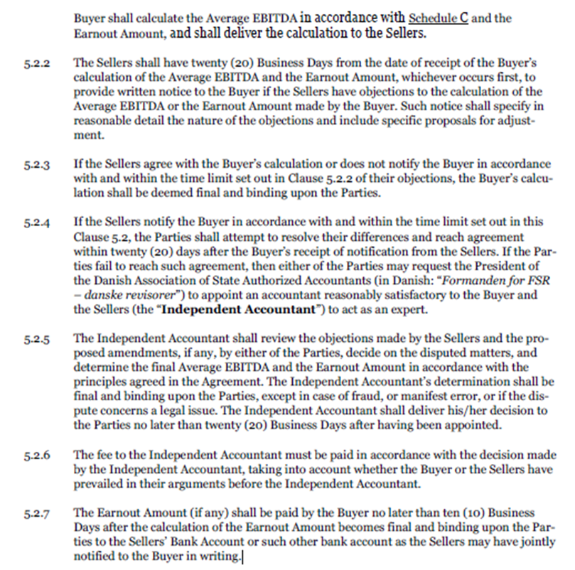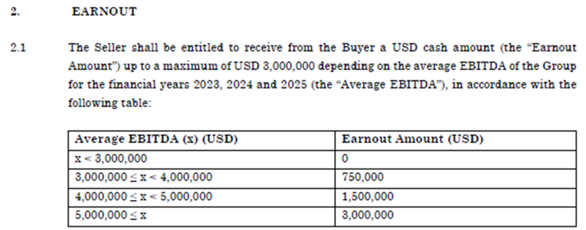 Ved nærværende earnout har Sælger ligeledes mulighed for at opnå én engangsregulering i form af et kontant earnoutbeløb baseret på fremtidig omsætning, der ligeledes vil blive udbetalt som ét beløb. Earnoutbeløbet er endvidere baseret på én samlet vurdering af, hvilket gennemsnitlige EBITDA A ApS og dets datterselskaber har opnået over alle 3 år, hvorfor "earnouten" også er baseret på én vurdering af, om Sælger ville være berettiget til Earnoutbeløbet.