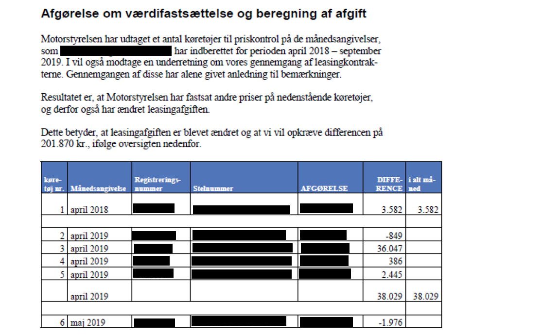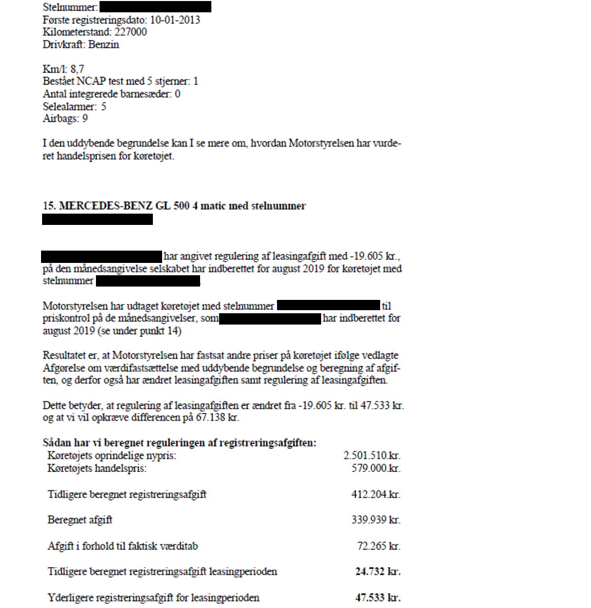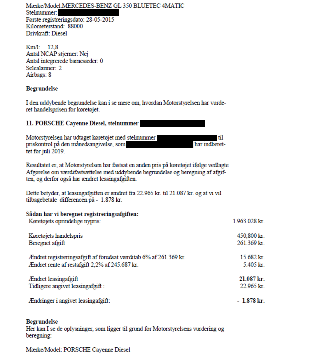 På baggrund af en sådan kontrol traf Motorstyrelsen den 25. november 2020 afgørelse om værdifastsættelse og beregning af leasingafgift vedrørende i alt 11 brugte køretøjer som selvanmeldt af H1 eller det nu opløste selskab H3 i perioden fra april 2018 til september 2019.