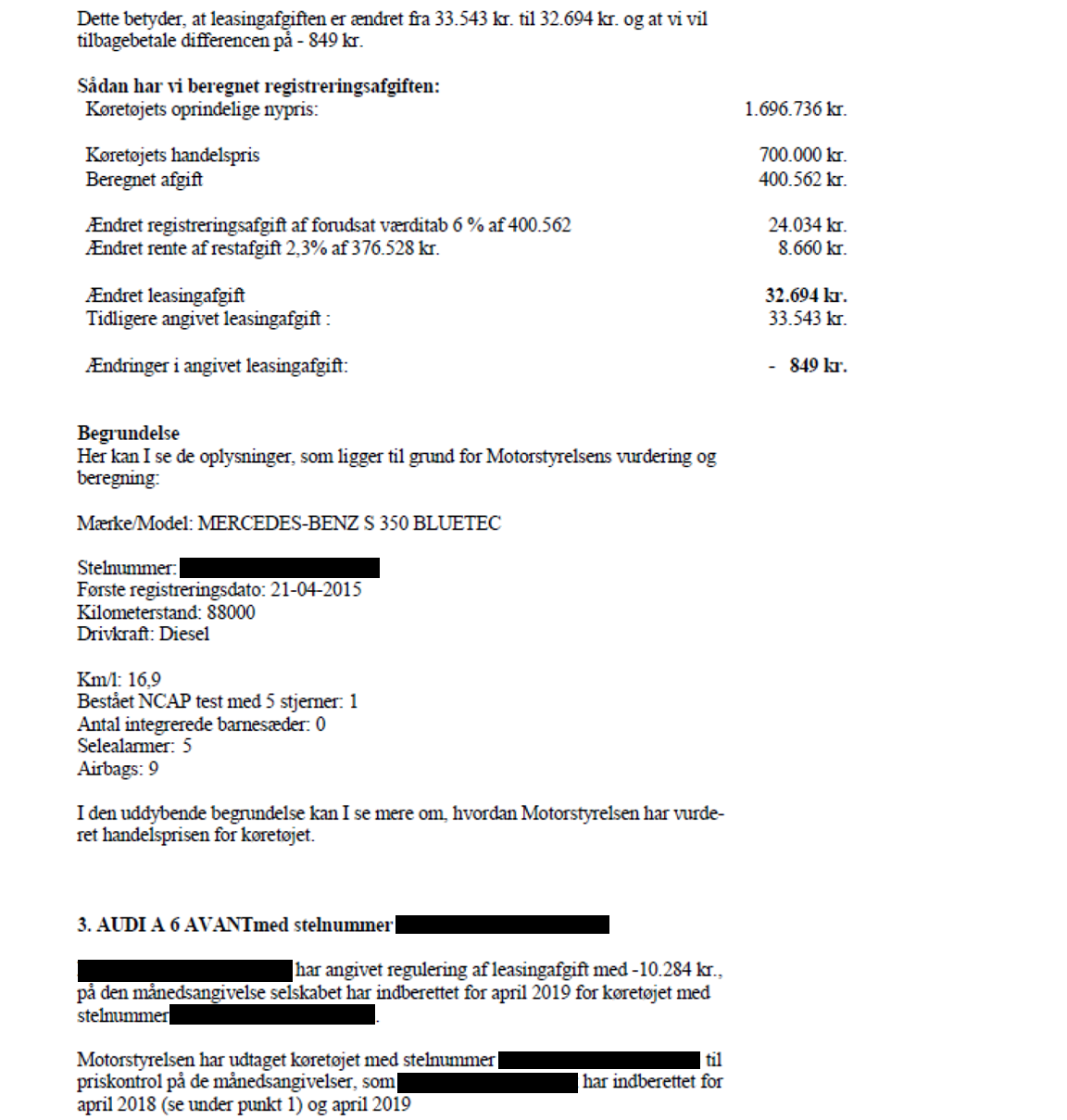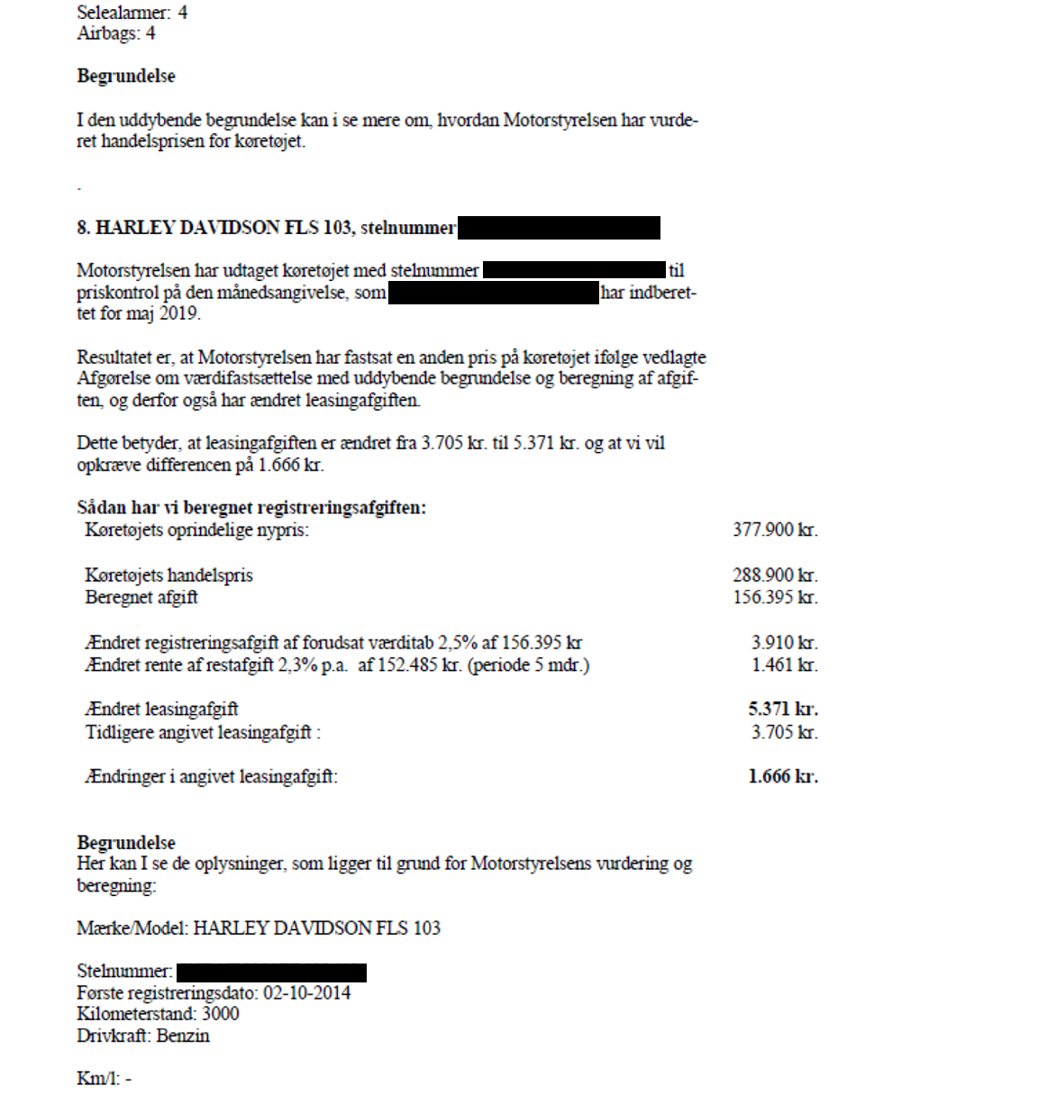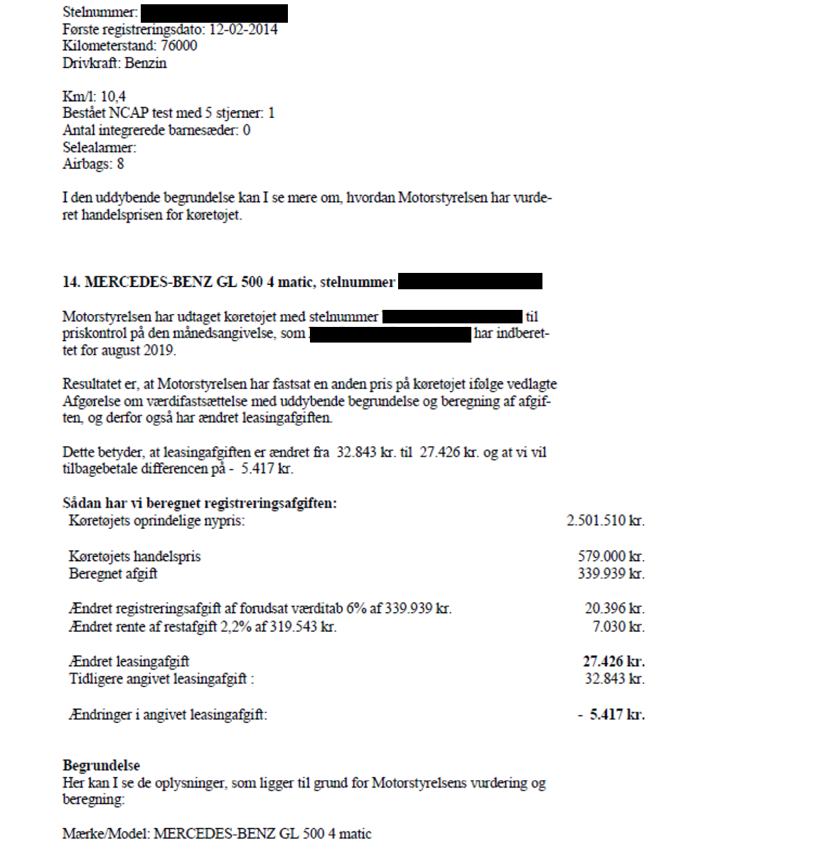 På baggrund af en sådan kontrol traf Motorstyrelsen den 25. november 2020 afgørelse om værdifastsættelse og beregning af leasingafgift vedrørende i alt 11 brugte køretøjer som selvanmeldt af H1 eller det nu opløste selskab H3 i perioden fra april 2018 til september 2019.