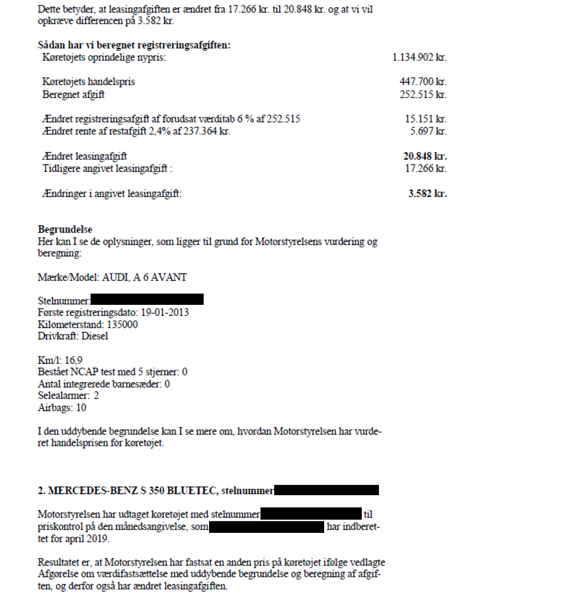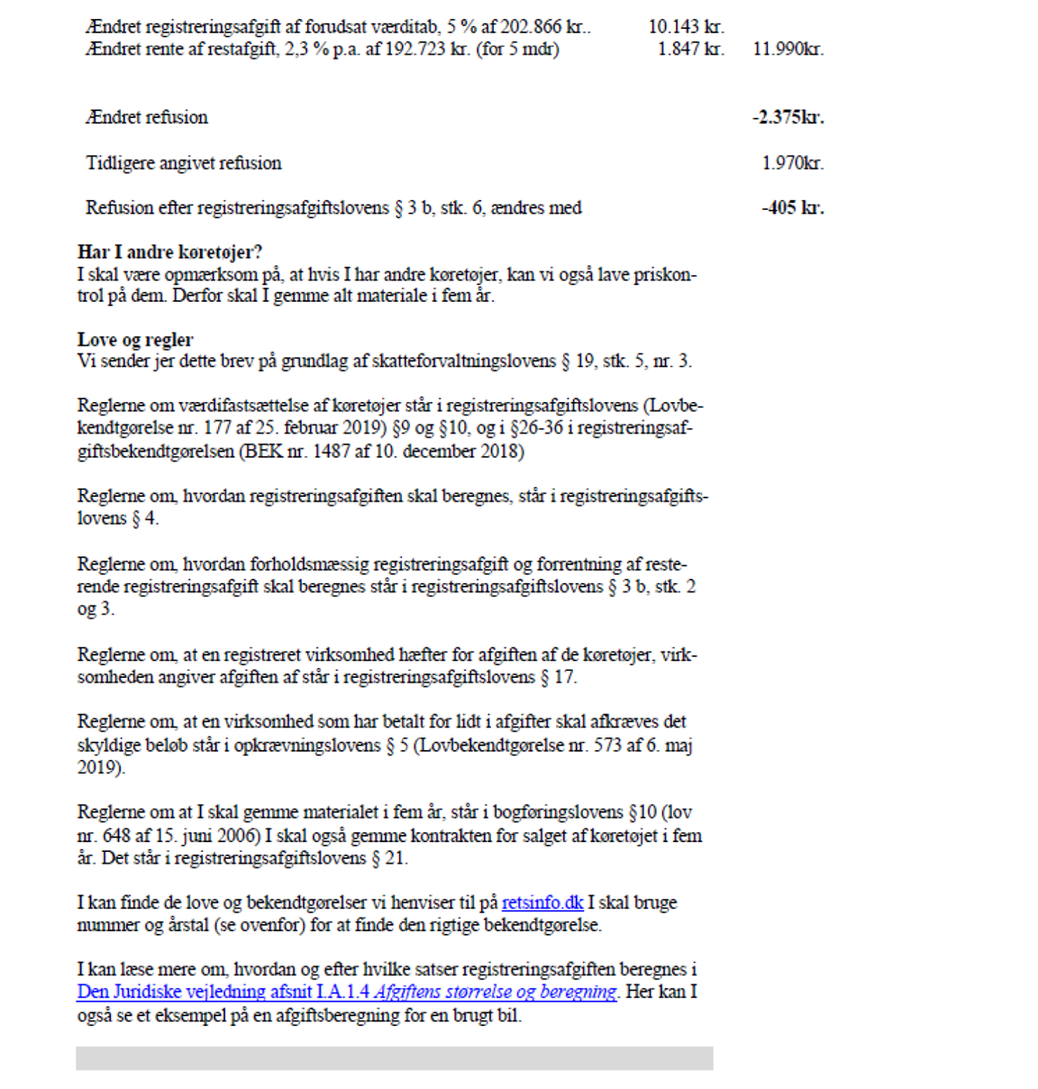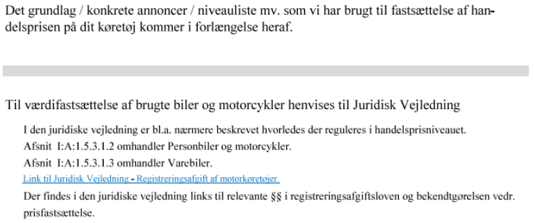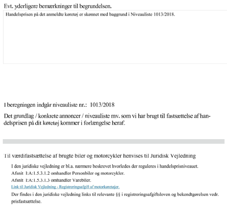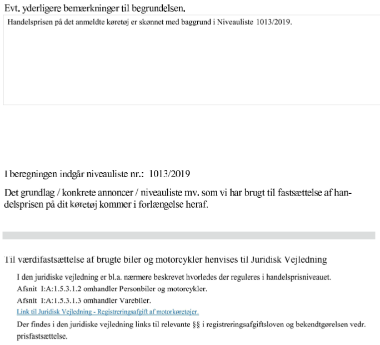 Motorstyrelsens afgørelse af 25. november 2020 indeholder desuden uddybende begrundelser for værdifastsættelsen af hvert enkelt køretøj. Alle uddybende begrundelser er ledsaget af "orientering/vejledning", som bl.a. indeholder en gengivelse af registreringsafgiftslovens § 10 og klagevejledning.