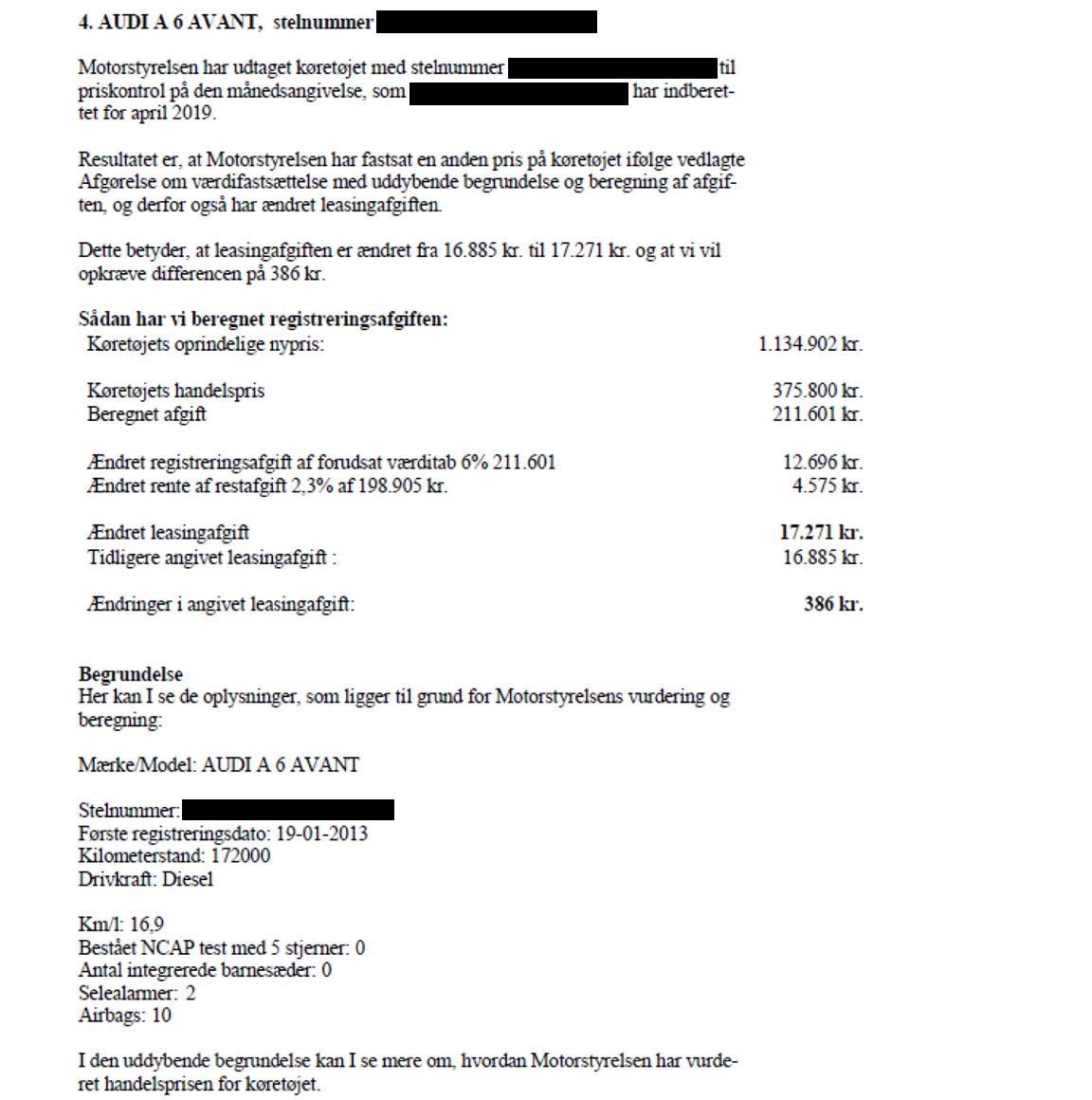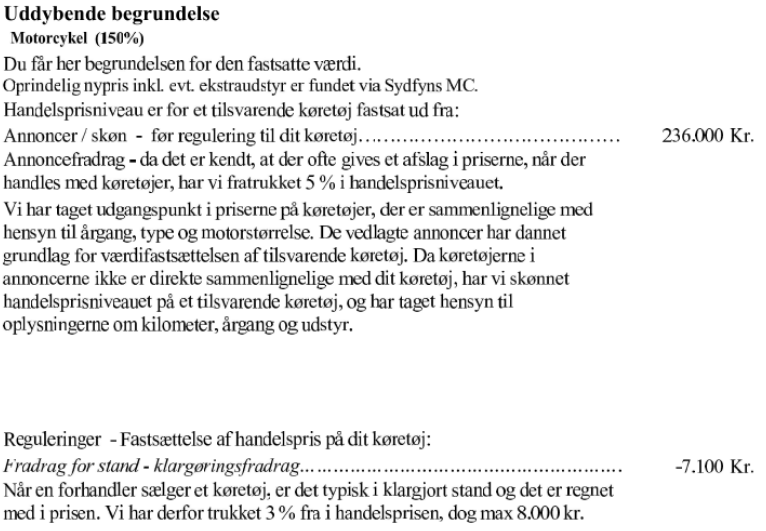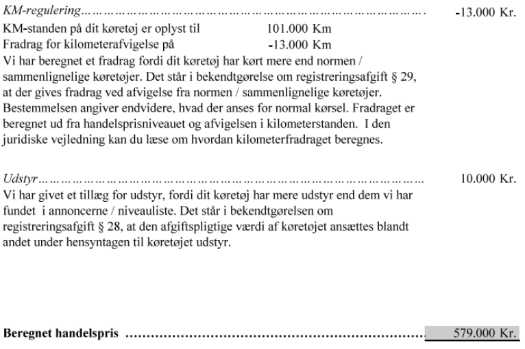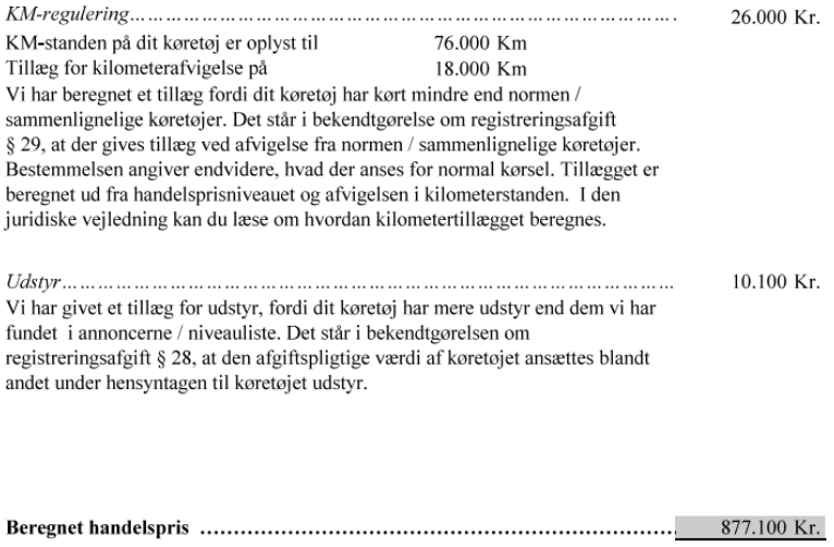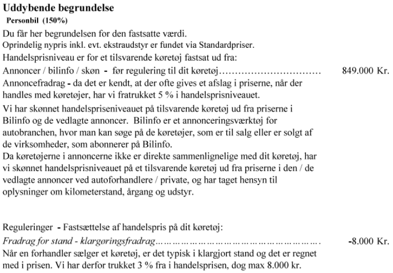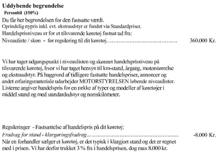 Det fremgår endvidere af den uddybende begrundelse, at der er anvendt vognkort til bestemmelse af udstyr, og at udstyrskoderne ikke stemmer overens med det anmeldte køretøjs vognkort, hvorfor standardpriser.dk er anvendt til at finde priser på ekstraudstyr.