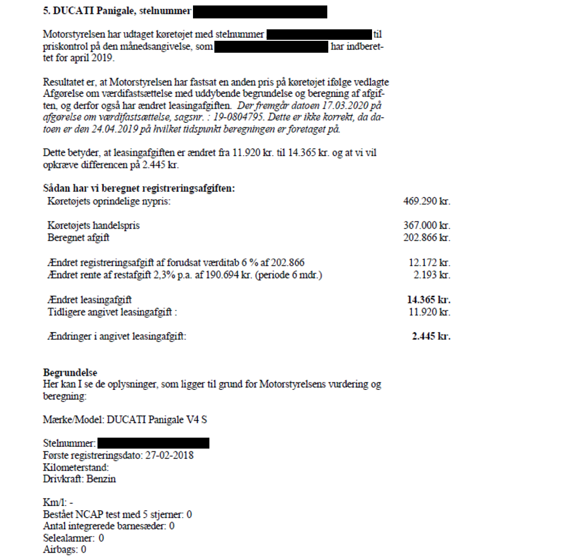 Der er ikke indekspriser tilgængelige på standardpriser.dk vedrørende motorcykler. Ved skønsfastsættelsen har Motorstyrelsen derfor taget udgangspunkt i en salgsannonce for en Ducati Panigale V4S fra MC Revyen 2018 og nedskrevet prisen med 20 pct. på baggrund af køretøjets alder. Motorstyrelsen har således fastsat prisen i overensstemmelse med den juridiske vejledning.