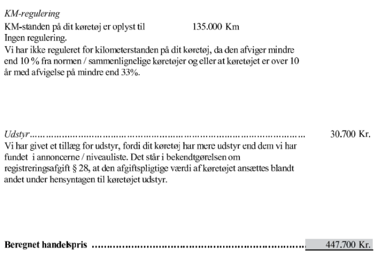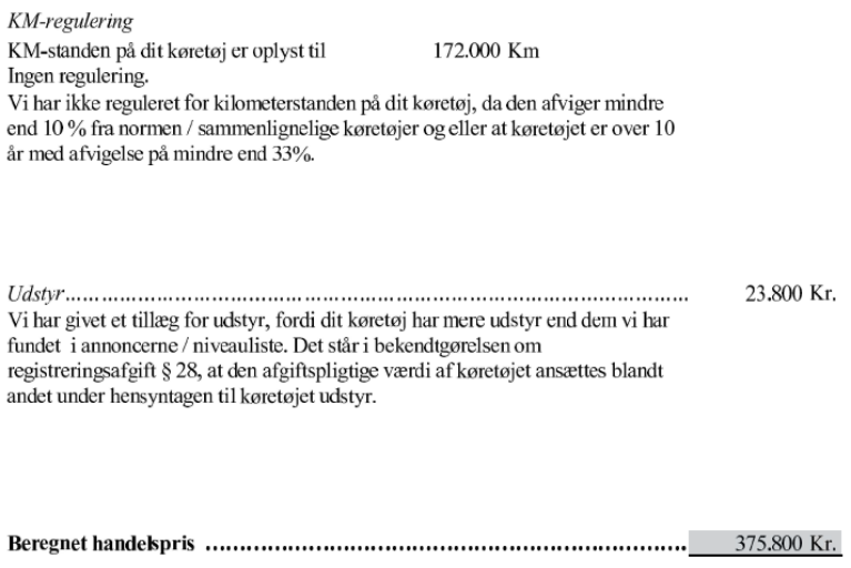 Uanset om det anførte kan fremstå lidt uklart formuleret, fremgår det med fuld fornøden tydelighed af det anførte, at, Motorstyrelsen, da de fremfundne køretøjer ikke var "direkte sammenlignelige" - altså ikke i tilstrækkeligt omfang identiske med det værdiansatte køretøj - foretog et skøn over de fremfundne handelspriser i stedet for at overføre de fremfundne handelspriser direkte til den omhandlede værdiansættelse, og at de ved dette skøn inddrog oplysningerne om kilometer, årgang og udstyr, idet køretøjerne på disse punkter netop var sammenlignelige.