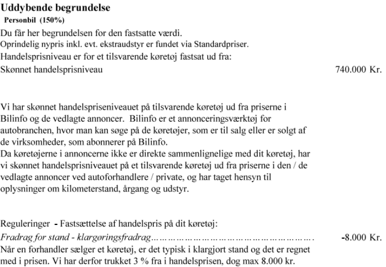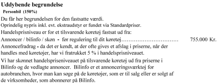 Det fremgår endvidere af den uddybende begrundelse, at nyprisen er udfundet ifølge tidligere afgørelse på køretøjet og standardpriser. Der er anvendt to af de af selvanmelder indsendte annoncer, som er skønnet for årgang, kilometerstand og ekstraudstyr. Der er herudover anvendt en yderligere annonce, som er skønnet for samme parametre.
