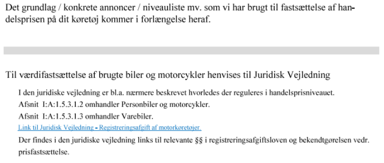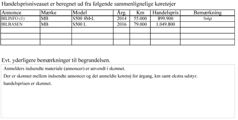 Det fremgår endvidere af den uddybende begrundelse, at den tilsidesatte annonce fra bilbasen havde en "liggetid" på 340 dage. Annoncerne for de to Range Rover Sport, som Motorstyrelsen har anvendt som sammenligningsgrundlag, fremgår ligeledes af begrundelsen, ligesom der er vedlagt en salgsannonce fra Den Blå Avis, anvendt som indikation for prisfastsættelsen. På annoncerne for de to Range Rover Sport er noteret bemærkninger om det foretagne skøn, herunder at sammenligningskøretøjernes handelspriser skønnes at være uden registreringsomkostninger.