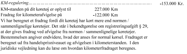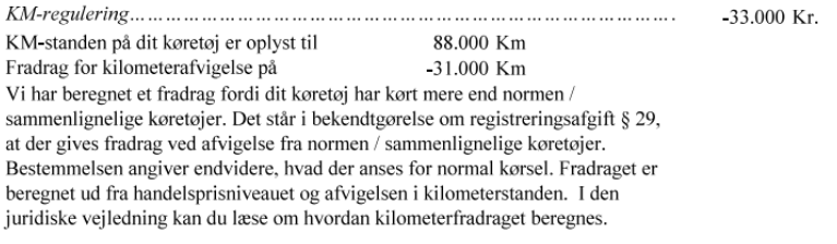 Motorstyrelsen har fravalgt visse af sagsøgerens annoncer "grundet underkørte kilometer". Sagsøgernes "annoncekøretøjer" (annoncer for sammenlignelige brugte køretøjer) er altså i visse tilfælde blevet fravalgt, fordi "annoncekøretøjet" har kørt markant færre kilometer end det køretøj, der skal værdifastsættes, hvilket har som konsekvens, at "annoncekøretøjets" annoncerede udbudspriser - efter Motorstyrelsens vurdering - ikke er udtryk for køretøjets almindelige pris ved salg til bruger her i landet, jf. registreringsafgiftslovens § 10 og registreringsafgiftsbekendtgørelsens § 26. Anvendelsen af udrykket "underkørte kilometer" kan for en umiddelbar betragtning fremstå indforstået, men det anvendte udtryk fører ikke til, at der foreligger en begrundelsesmangel. Dette gælder navnlig, når der som her er tale om et område med masseadministration, og når afgørelsen (og begrundelsen) ikke retter sig mod en forudsætningsløs anmelder af brugte køretøjer til afgiftsberigtigelse, men derimod en professionel selvanmelder (registreret virksomhed), der som led i sin leasingvirksomhed foretager anmeldelser af brugte køretøjer til afgiftsberigtigelse, og som må antages at være fuldt bekendt med de relevante retsregler og Motorstyrelsens værdiansættelsesmetode for brugte køretøjer.