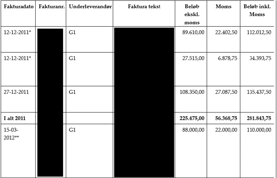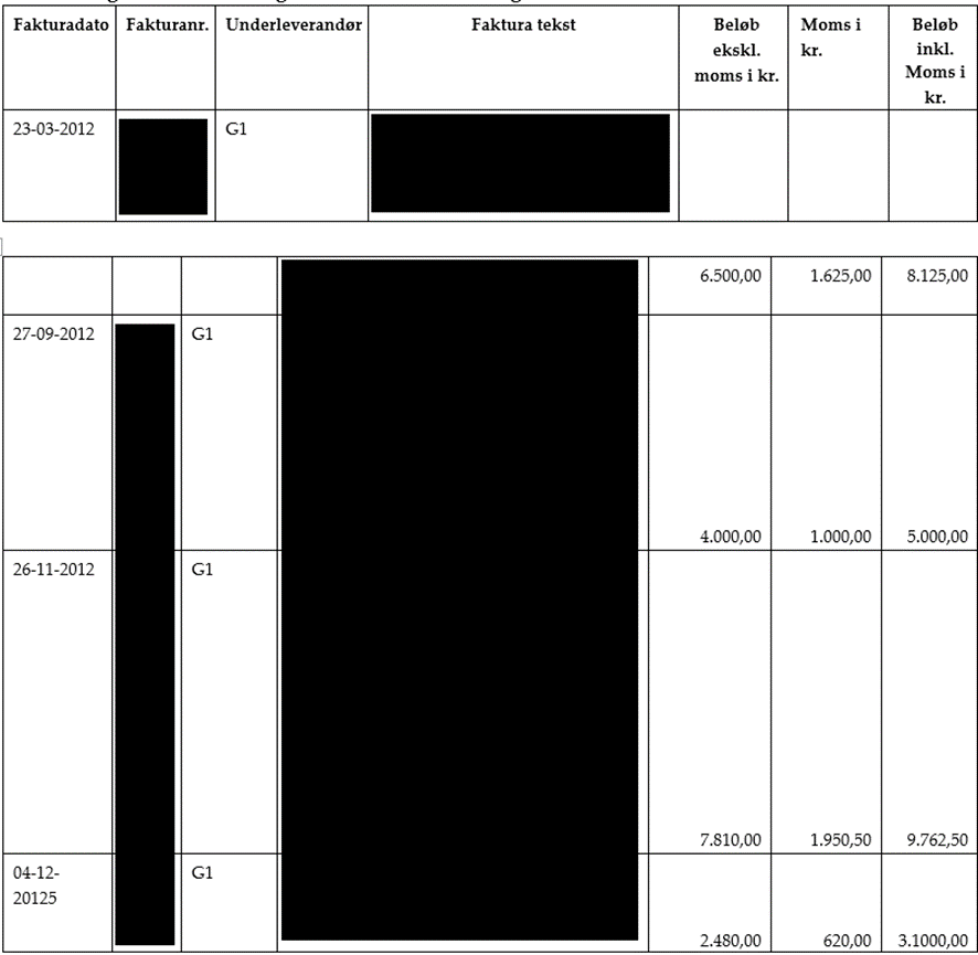Fakturaerne, som er omfattet af denne sag, er udstedt af G1-virksomhed og påført post-its med et håndskrevet kontonummer. Fakturaerne indeholder ikke en specifikation af ydelsernes omfang, enhedspriser eller takster og ingen oplysning om den dato, hvor ydelserne er udført eller afsluttet. Der findes ingen opgørelse, som kan dokumentere, at fakturaerne dækker over et reelt timearbejde. Der er ingen kontrakt mellem H1 og G1-virksomhed, som kan dokumentere en aftale om levering af arbejdsydelser, og H1 har ikke nogen dokumentation for et løbende samhandelsforhold, herunder i form af kommunikation om arbejdsopgaver med nogen fra G1-virksomhed, selv om flere fakturaer bærer teksten "ifølge aftale", "ifølge tilbud" og lignende.
