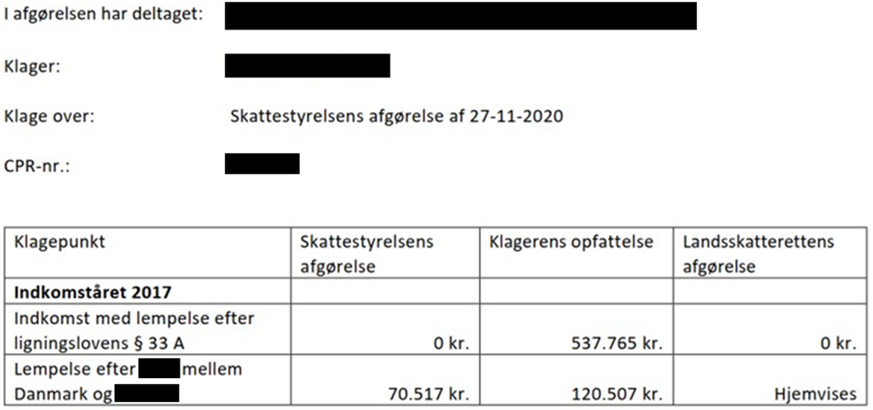 Skattestyrelsen har ikke godkendt lempelse efter ligningslovens § 33 A, stk. 1, af skatten af lønindkomst optjent i perioden (red.fjernet.dato) - 29. juli 2017 på i alt 537.765 kr.