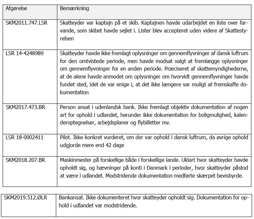 • SKM2019.512.ØLR omhandlede en person, som var ansat i en udenlandsk bank. Det var i det hele udokumenteret, at skatteyderen havde opholdt sig i Y25-land i mindst 6 måneder. Den dokumentation, som var fremlagt af skatteyder, var modstridende. Endvidere blev en række oplysninger først fremlagt på et sent tidspunkt i sagen. Det medførte ifølge skattemyndighederne, at skatteyderen havde en skærpet bevisbyrde.