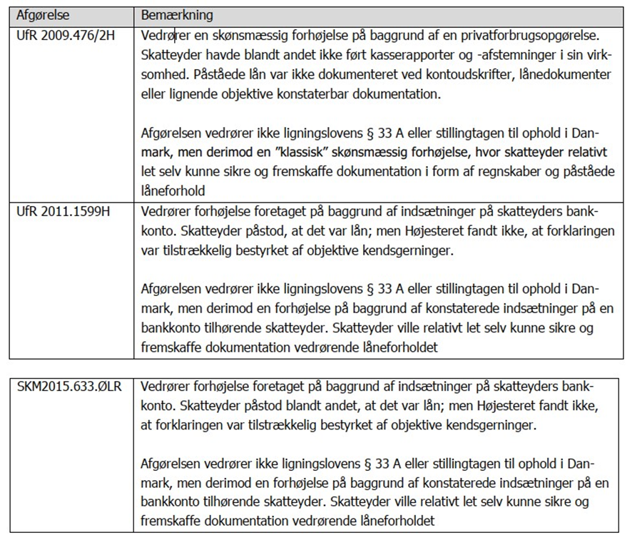 Som det fremgår, vedrører de af sagsøgte nævnte afgørelser ikke ligningslovens § 33 A og vurdering af opholdsdage; men derimod situationer, hvor der er konstateret en indsætning på en bankkonto og/eller en negativ privatforbrugsopgørelse. Disse situationer er ikke sammenlignelige med sagsøgers situation.