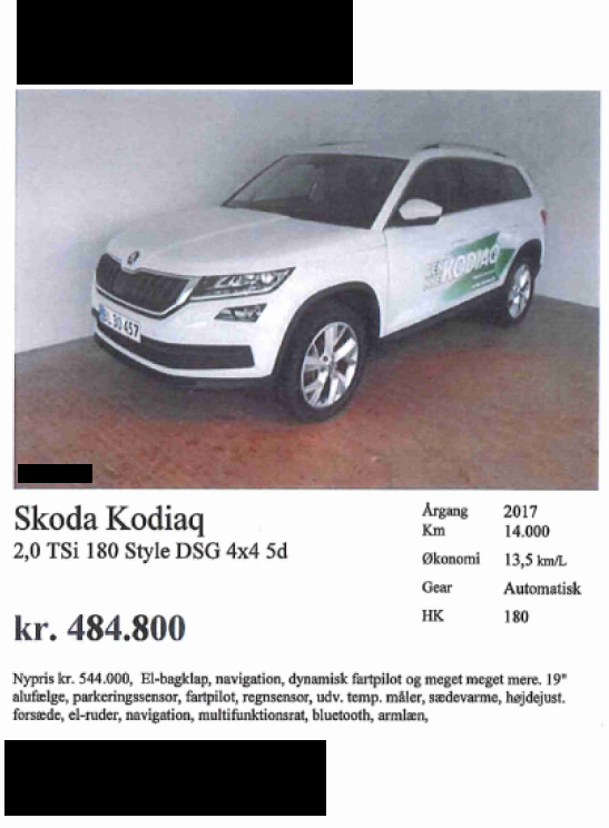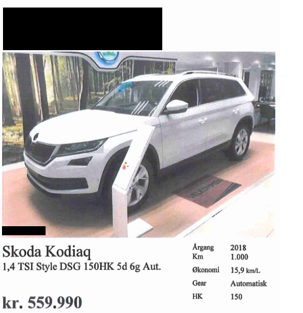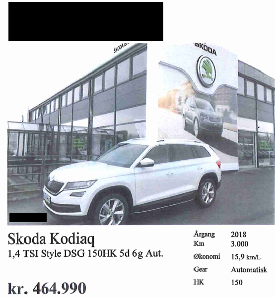 | 7. | -/2018 | 3.000 | Skoda Kodiaq 1,4 TSi Style DSG 150HK 5d 6g Aut. Annonceret hos forhandler (postnr. 6). Annonceringsdato og -pris: Udateret til 464.900 kr. |