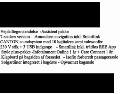 | "Anmelders materiale. Dette køretøj har følgende ekstraudstyr Vejskiltegenkendelse Assistenspakke Amundsen navigation Canton soundsystem smartlink style plus pakkev/ass.pakke klapbord solgardiner i bagdør varme i bagsæde ialt Anmeldte køretøj har følgende ekstraudstyr style plus |