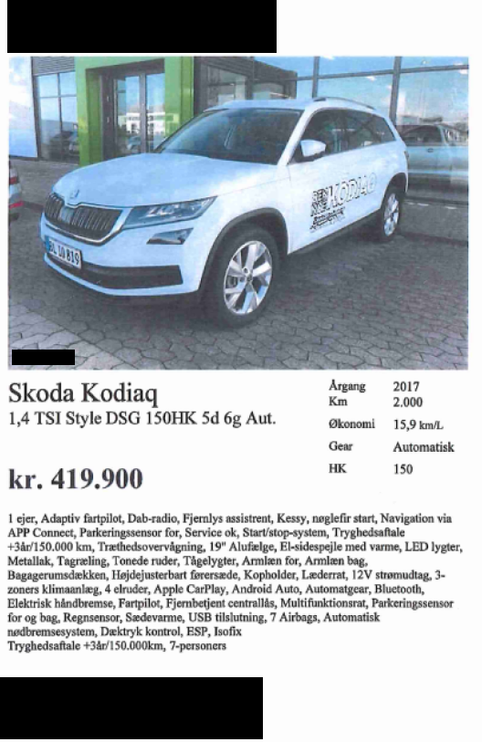 | 8. | -/2017 | 2.000 | Skoda Kodiaq 1,4 TSi Style DSG 150HK 5d 6g Aut. 1 ejer, Adaptic farpilot, Dab- radio, Fjernlys Aassistrent, KEssy, nøglefri start, Naviga- tion via. APP Connect, Parke- ringscensor, for, Service ok, Start/stop-system, Tryghedsaf- tale +3år/150.000 km, Træheds- overvågning, 19" Alufælge, El- sidespejle med varme, LED lysgter, Metallak, Tagræling, Tonede ruder, Tågelygter, Armlæn for, Armlæn bag, Baggagerumsdækken, Høj- dejusterbart førersæde, Kop- holder, Læderrat, 12V strøm- udtag, 3- zoners klimaanlæg, 4 elruder, Apple CarPlay, An- droid Auto, Automatgear, Blu- etooth, Elektronisk hånd- bremse, Fartpilot, Fjernbetjent centrallås, Multifunktionsrat, Parkeringssencor for og bag, Regncensor, Sædevarme, USB tilslutning, 7 airbagsm Auto- matisk nødbremsesystem, Dæktrykkontrol, ESP, ISoflix, Tryghedsaftale +3år/150.000km, 7-personers Annonceret hos privat/for- handler (postnr. 7). Annonceringsdato og -pris: Udateret til 419.900 kr. |