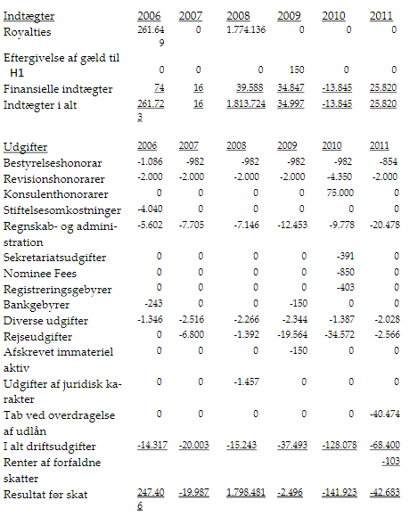 "… services rendered to H1 - tidligere navn in connection with the preparation of various documents required for the commencement of operations of the company including the opening of bank accounts, change of name to H1 and other related services to 4 June 2006."