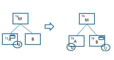 En aktivitet i datterselskabet A grenspaltes til det eksisterende selskab B, der sambeskattes med A og M. Før spaltningen er As underskud et "eget underskud", der hos A kan modregnes i trin 2. Ved grenspaltningen forbliver underskuddet i A. Efter grenspaltningen kan underskuddet fortsat modregnes i trin 2 hos A og i trin 4 hos B.