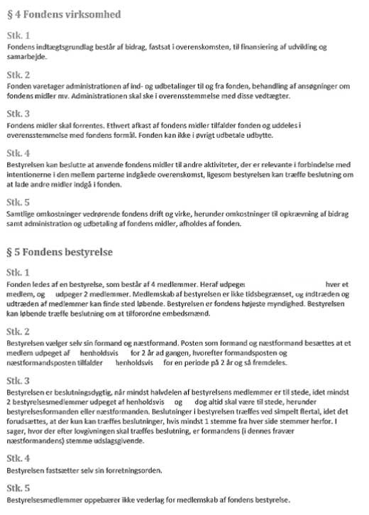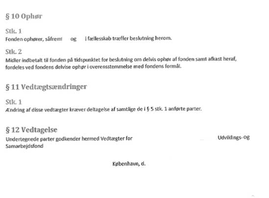 Videre gælder, at Overenskomstfondene ej heller ophører, fordi den pågældende overenskomst udløber eller genforhandles. Overenskomstfondene ophører alene i det omfang medlemmerne er enige herom, eller i det omfang Overenskomstfondene som følge af ændret lovgivning på arbejdsmarkedsområdet måtte blive overflødige.