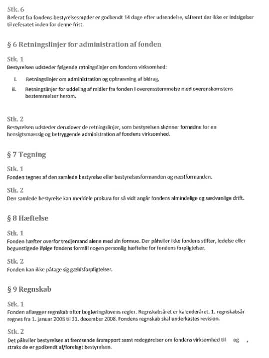 Fonden hæfter alene over for tredjemand med sin formue, og hverken stifter, ledelse eller begunstigede i forhold til fonden hæfter personligt for fondens eventuelle forpligtelser, jf. vedtægternes § 8.