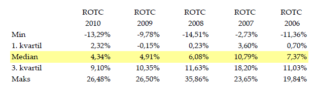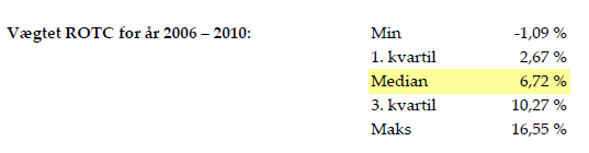 Endvidere fremgår det af sagen, at SKAT ved beregningen af G1s afregningspriser for levering af ydelser til H2 ApS foretog en benchmark-analyse af 25 sammenlignelige advokat- og revisionsselskaber med Return on Total Cost (herefter RoTC) som profit levelindicator. Det er oplyst, at RoTC er beregnet således, at selskabernes overskud (resultatet før renter og skat) er divideret med udgifterne (totale omkostninger). Benchmark-analysen viste en markeds-RoTC median på 6,72 pct., hvilket indebar, at skattemyndighederne mente, at G1 var berettiget til at opnå en fortjeneste på 6,72 pct. set i forhold til G1s udgifter, og at G1s udgifter med den nævnte mark-up kunne godkendes som det beløb, som H2 ApS' udgifter til G1 skattemæssigt kunne udgøre for perioden 2006-2010 (ca. 20 mio. kr.).