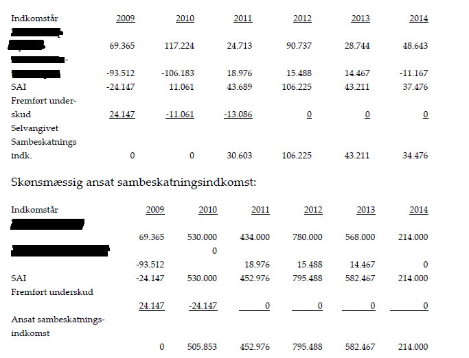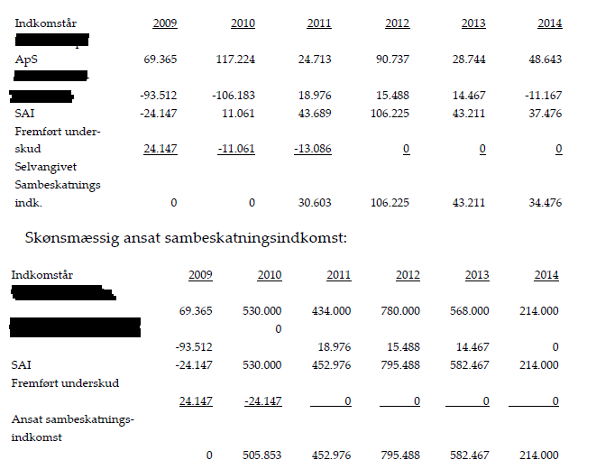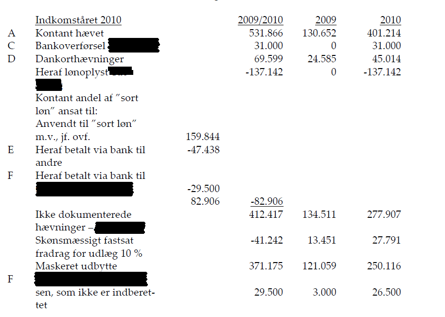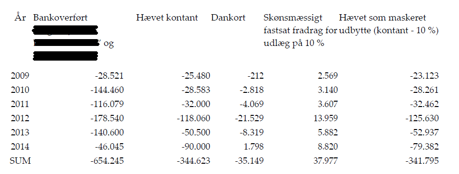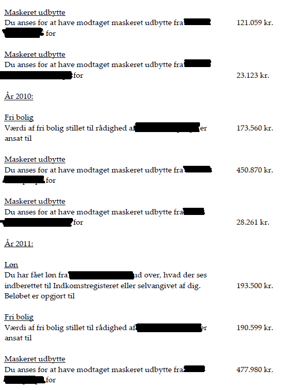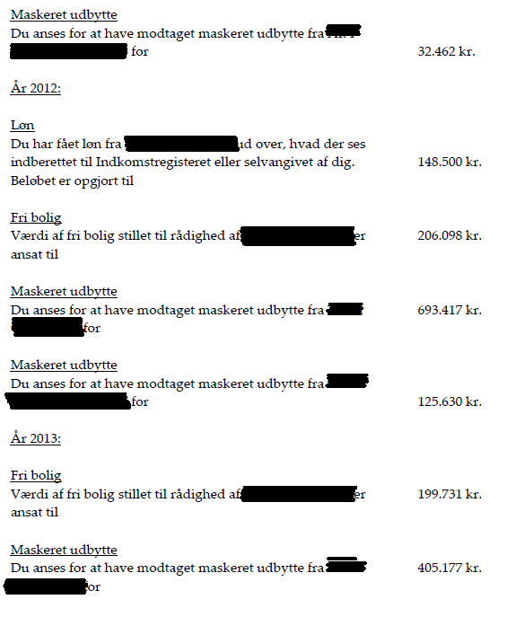 Samlet forhøjede skattemyndighederne skønsmæssigt Bs indkomst med i alt 2.794.471 kr. som maskeret udbytte for 2009-2014. SKAT opgjorde maskeret udbytte for hvert kalenderår som følger: