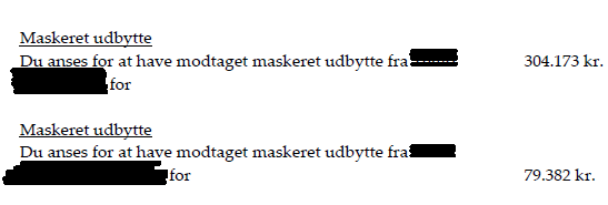 Hævet som maskeret udbytte | 23.123 | 28.261 | 32.462 | 125.630 | 52.937 | 79.382 | 341.795 |