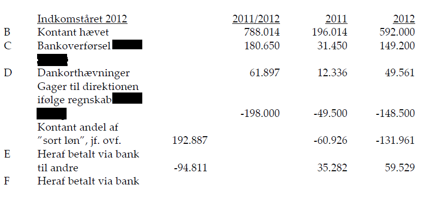 G1-virksomhed har regnskabsår fra 1/10-30/9, hvilket er årsag til at beløbene for hvert kalenderår er splittet op i 2 perioder. Som det fremgår af den øverste del af oversigten har der været udokumenterede hævninger i selskabet, der ikke kan relateres til driften af G1-virksomhed. Disse hævninger består af kontante hævninger på selskabets bankkonto, bankoverførsler til B og dankort hævninger. I årsregnskaberne 2010/2011 og 2011/2012 står der i note 9 anført gager til direktionen på 198.000 kr. Der er ikke sket indberetning til Indkomstregisteret heraf i kalenderårene 2011 og 2012. I kalenderåret 2010 er der indberettet løn til B fra G1-virksomhed med 18.000 kr. pr. måned. Af disse kan 54.000 kr. henføres til månederne oktober, november og december år 2010. Der mangler således i år 2011 at blive indberettet 198.000 kr. minus 54.000 kr. = 144.000 kr. til Indkomstregisteret. Da SKAT har konstateret, at der løbende hæves beløb fra G1-virksomhed bankkonto i form af kontanter mv. er de 144.000 kr. anset for udbetalt i den forbindelse, hvorfor de fragår i ovenstående opgørelse under "Gager direktion, ej lønoplyst". Der er heller ikke i G1-virksomhed indberettet løn til B i perioden 1.10.2011-30.9.2012, mens der ifølge regnskaberne er udbetalt gager til direktionen med 198.000 kr. SKAT har derfor periodiseret lønnen med 3/12 til indkomståret 2011 opgjort til 49.500 kr. og 9/12 tilhørende indkomståret 2012 opgjort til 148.500 kr. Henset til de mange hævninger af kontanter og bankoverførsler på selskabet konto anses lønnen for udbetalt derigennem.
