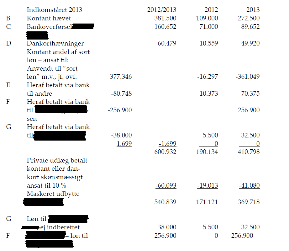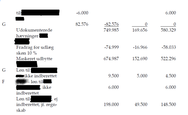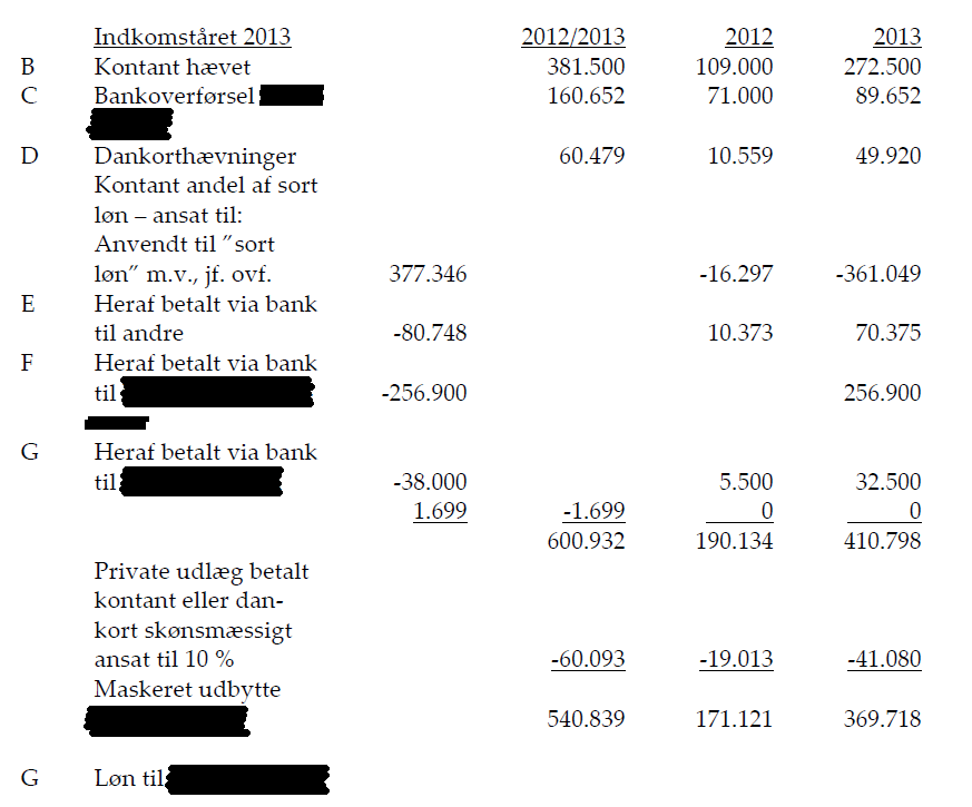 Der er i G1-virksomhed givet fradrag for "sort løn", hvilket vil sige den lønudgift der er afholdt i selskabet, men som ikke er blevet indberettet til Indkomstregisteret. Da kun noget af den "sorte løn" umiddelbart kan identificeres ud fra bankkontoudtogene, er den resterende del af den "sorte løn" anses for udbetalt kontant, hvorfor denne andel er fratrukket (godskrevet B) i opgørelsen over de hævninger som ikke kan relateres til driften af selskabet. SKAT har herefter givet et yderligere skønsmæssigt nedslag på 10 %, idet det ikke kan udelukkes, at visse af de i G1-virksomhed udokumenterede hævninger i kontanter eller med dankort kan være anvendt til afholdelse af selskabs relaterede udgifter. Som det fremgår af ovenstående talmæssige opgørelse er den restende del af de udokumenterede hævninger anset for tilgået B som maskeret udbytte.