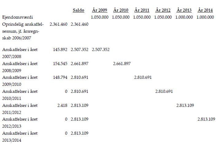 Ejendommen er oprindeligt anskaffet i selskabet d. 1.3.2007. I årsregnskabet 2007/2008 står ejendommen opført til en anskaffelsessum primo på 2.361.460 kr. Ejendommen er i årsregnskabet optaget til en handelsværdi på 2.507.352 pr. 30.9.2008. Den offentlige ejendomsværdi udgør 1.050.000 kr. i år 2009 og 1.000.000 kr. i år 2013, jf. nedenfor.