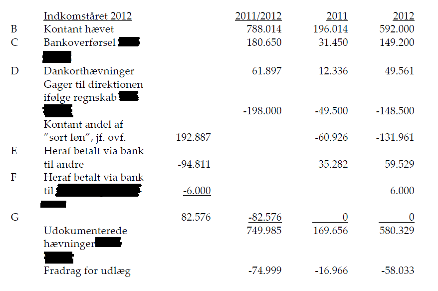 Samlet konstaterede SKAT altså ved sin gennemgang af G1-virksomhed' og G2-virksomhed' kontoudtog for perioden fra 1. oktober 2009 til 30. december 2014, jf. bilag J og Æ, at der var foretaget betydelige kontanthævninger, Dankort-transaktioner, overførsler til B og A, samt lønudbetalinger til andre end det tidligere ægtepar, uden at selskaberne, B eller A fremlagde dokumentation for, at det store antal transaktioner var relateret til selskabernes drift.