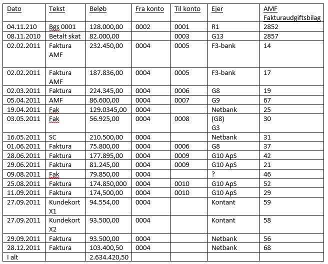 Beløbsmæssigt er der tale om pengestrømme fra selskabets konto, svarende til beløbene i skemaet ovenfor på samlet 2.634.420,50 kr. og bilag 768, 781 og 933, der samlet udgør 326.898 kr. inkl. moms, hvilket i alt udgør 2.961.318 kr.