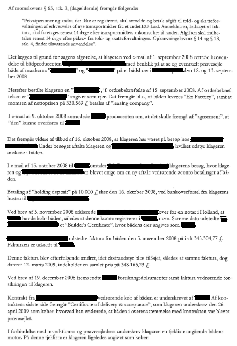 Efter bevisførelsen lægger retten som ubestridt til grund, at det engelske værft G1-virksomhed byggede en båd, der skulle stilles til rådighed for A, som boede i Danmark. Retten lægger videre til grund, at båden var på over 7,5 m, og at båden ikke var brugt, da den blev stillet til rådighed for A. Endelig lægger retten til grund, at prisen for båden omregnet var 2.960.160 kr. uden ekstraudstyr og eksklusive moms, og at momsen derfor udgør 740.040 kr.