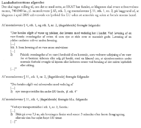 Sagen angik, om sagsøgeren, som var en privatperson, skulle betale dansk erhvervelsesmoms af en ny båd på over 7,5 meter, som sagsøgeren havde leaset ved et hollandsk leasingselskab, i medfør af momslovens § 11, stk. 1, nr. 2, jf. stk. 6, nr. 2 (dagældende stk. 4, nr. 2), jf. § 65, stk. 2 (dagældende stk. 3).