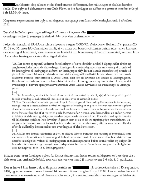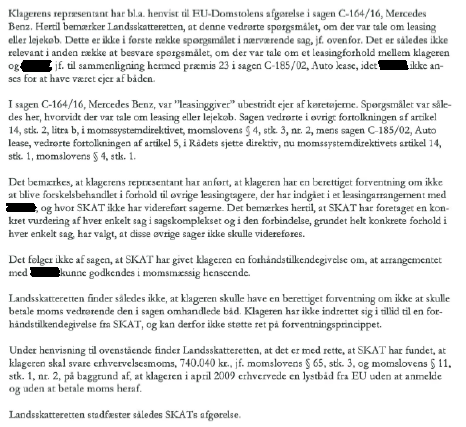 Uanset, om købsoptionen var 10,5% eller 53,4% af købsprisen, er der tale om et ikke ubetydeligt beløb. Langt vigtigere er, at selve optionsprisen er et beløb, der går udover betaling af leasingydelser og depositum, modsat i ovennævnte afgørelse.