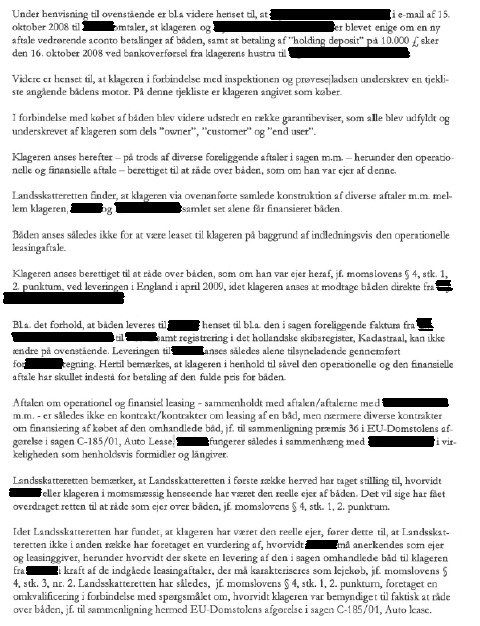 Landsskatteretten har i afgørelsen i prøvesagen af 17. oktober 2014 (bilag 3) allerede taget stilling til, om det omhandlede såkaldte dansk-hollandske grænseoverskridende leasingarrangement var i overensstemmelse med gældende momsregler, således at A ikke momsmæssigt kan anses for at have erhvervet båden.