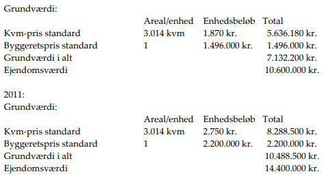 For så vidt angår vurderingsåret for 2011, indebærer anvendelse af den lave sats for de kvadratmeter, der overstiger 1.400 kvadratmeter en nedsættelse af grundværdien til 7.814.400 kr. og udgør dermed en ændring i grundværdien på 25,5 pct.