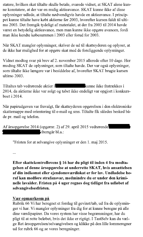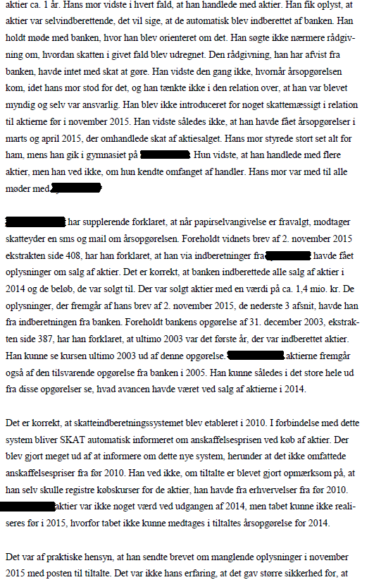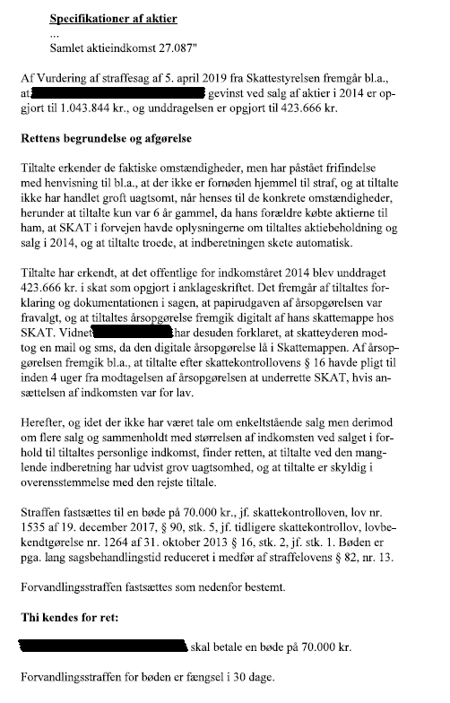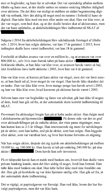 T erkendte de faktiske forhold. T forklarede, at han kun var 6 år gammel, da hans forældre købte aktierne til ham, at told- og skatteforvaltningen i forvejen havde oplysningerne om Ts aktiebeholdning og salg i 2014, og at T troede, at indberetningen skete automatisk.