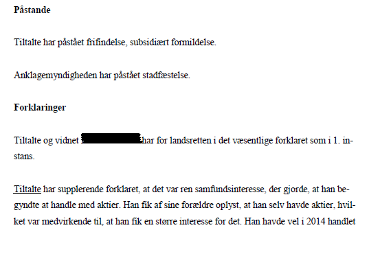Landsretten frifandt T, idet grov uagtsomhed ikke fandtes bevist. Den lagde vægt på, at told- og skatteforvaltningen var klar over hvilke aktier T var blevet ejer af de pågældende år og ultimo kurserne for 2003 og 2005 for de aktier, sagen vedrører. Banken havde foretaget indberetning over samtlige køb og salg i 2014, herunder hvilke beløb de var solgt for og T blev orienteret herom. Af Ts årsopgørelser fremgik at der manglede oplysninger for at kunne beregne på alle hans værdipapirer, men ikke hvilke. T fik brev fra told- og skatteforvaltningen i perioden mellem de to årsopgørelser, om at de havde fået nye oplysninger om Ts værdipapirer og T skulle ikke selv foretage sig yderligere. Først ved brev af 2. november 2015 fra told- og skatteforvaltningen som T reagerede på straks, blev T klar over at told- og skatteforvaltningen manglede oplysninger.