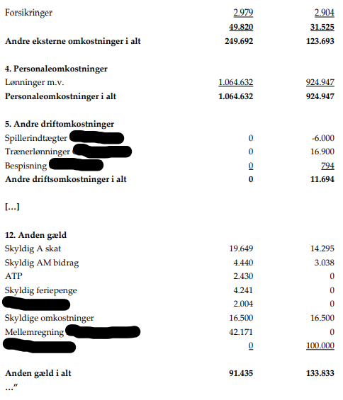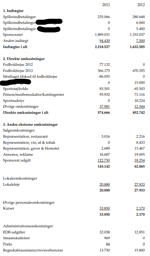 Af årsrapporten for 2013 (bilag 6, E88 ff) fremgår det blandt andet, at G1 i dette år havde såkaldte "direkte omkostninger" på i alt 574.666 kr. Af note 2 til årsrapporten fremgår, at disse omkostninger blandt andet dækker over en "fodboldrejse" til en værdi af 366.175 kr. Det vil sige, at mere end 63 pct. af foreningens omkostninger i 2013 hidrører fra en fodboldrejse, som ifølge foreningens tidligere hjemmeside gik til (red. ferie fjernet) i 2012-2014, jf. bilag 2, side 9, (E150). Det samme gjorde sig gældende i 2014, hvor der ifølge årsrapporten er brugt 420.486 kr. på en fodboldsrejse ud af de samlede direkte omkostninger på 652.674 kr. (bilag 7, side 8 og 11, E134 og E137). Derudover har G1 i begge år haft en række eksterne omkostninger, der ifølge note 3 til regnskaberne (E99 og E138) blandt andet dækker over poster som "Repræsentation restaurant", "Repræsentation vin, tobak, øl", "Repræsentation gaver, blomster".