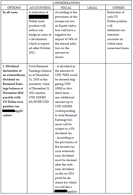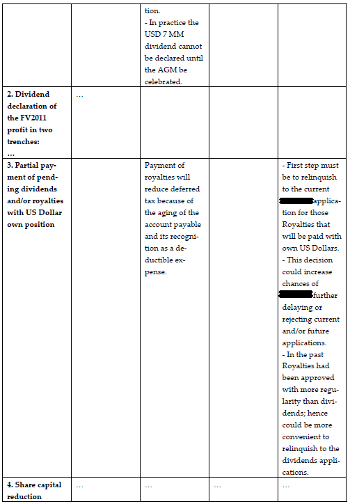 af de udestående royaltyfordringer (eller - alternativt - til betaling af de endnu ældre, udestående udbyttebeløb) ville være en klar og åbenlys overtrædelse både af G12-virksomhed-systemets indhold og intentionerne bag, da G2-virksomhed så nærmest ''provokativt" ville klargøre over for den venezuelanske regering, at man havde anvendt sparsom udenlandsk valuta til betalinger, som man endnu ikke havde fået tilladelse til at veksle og udføre, hvorimod en brug af dollarbeløbet til betaling af den nylige beslutning om et ekstraordinært udbytte ansås for at have færre skadevirkninger i forhold til G12-virksomhed-systemet, da den blandt andet ikke krævede en G12-virksomhed-ansøgning (som anført i skemaet) eller tilbagekaldelse af allerede indleverede ansøgninger.