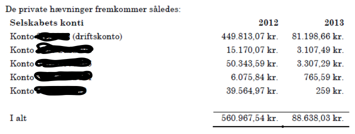 Ved gennemgang af G1 A/S' kontoudskrifter har SKAT konstateret hævninger af privat karakter fra selskabets konti for i alt 560.967 kr. i 2012 og 88.638 kr. i 2013, jf. bilag A.