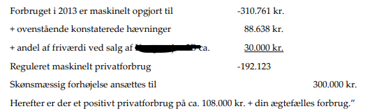 det maskinelt beregnede privatforbrug har været på 665.000 kr. i 2011 og 500.000 kr. i 2012 (efter regulering med private hævninger, se side 1) og før din ægtefælles forbrug."