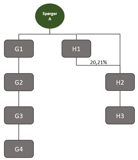På nuværende tidspunkt ejer A nominelt 79,79 % af anparterne i H2. De resterende 20,21 % er ejet af H1, som er ejet 100 % af A. Strukturen er simplificeret illustreret nedenfor: