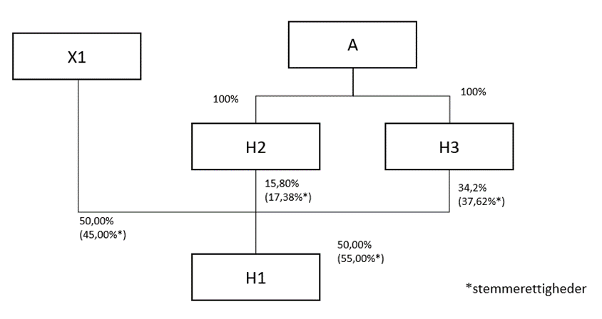A har 50 % ejerskab og 55 % stemmer i H1 via de af ham 100 % ejede selskaber H2 og H3. H2 har en ejerandel på 15,80 %, og at H3 har en ejerandel på 34,2 %.
