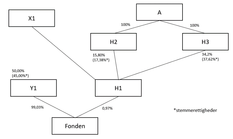 H1 ejer således 0,97 % af kapitalen i Fonden, mens spørger kontrollerer H1 gennem sine to holdingselskaber, H2 og H3.