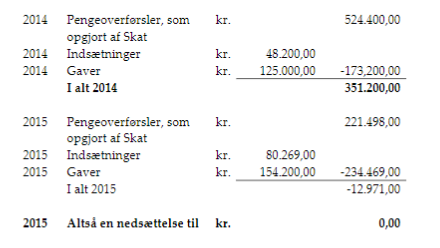 Såvel Skattestyrelsen som Skatteankenævnet har jo netop ved deres afgørelser beskattet sagsøger for disse "indtægter" og når sagsøger foretager de pengeoverførsler, som i 2014 udgjorde kr. 524.400,29 og i 2015 udgjorde kr. 221.498,89, så følger det af Skattemyndighedernes allerede skete beskatning af "Indsætninger " og "gaver", at beskatningen af de til udlandet overførte beløb, må nedsættes med kr. 173.200 i 2014 og det fulde beløb, kr. 221.498 i 2015.
