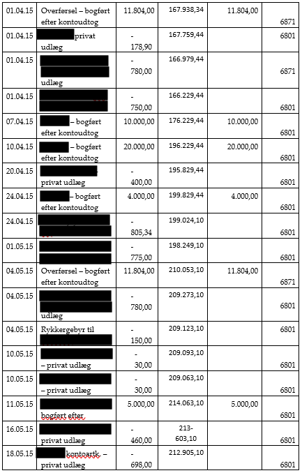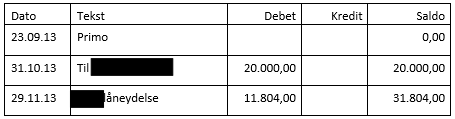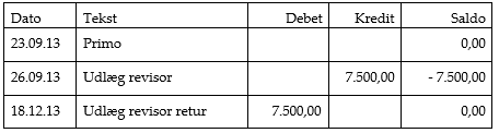 Der skal til støtte herfor henvises til oversigten ovenfor på side 6, hvoraf det udtrykkeligt fremgår, at mellemregningskontoen på intet tidspunkt udviser en debetsaldo, ligesom det i øvrigt fremgår, at A fortsat havde et tilgodehavende på kr. 7.768,69 i Selskabet den 30. juni 2015. Det skal hertil bemærkes, at beløbet på kroner og øre er identisk med opgørelsen i bilag 11 (ekstrakten side 7374), hvilket er den af revisor udarbejdede opgørelse over As mellemregning med Selskabet.