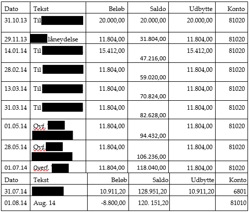 Skatteministeriet bestrider i den forbindelse, at dokumentet "Lånearmortisering" (E67), som A påberåber sig, kan tillægges bevismæssig betydning. Dokumentet er udateret, ligesom det ikke fremgår af dokumentet, hvem der har udarbejdet dokumentet, eller hvem der er långiver og låntager. Selv hvis dokumentet lægges til grund, stemmer oplysningerne om lånets ydelser dog under alle omstændigheder ikke overens med, at selskabet pr. 30. juni 2014 alene havde "anden gæld" på 73.878 kr. (E96). Det ville i givet fald forudsætte, at selskabet på dette tidspunkt havde afdraget 366.122 kr. på gælden, selvom det altså følger af dokumentet "Lånearmortisering", at der pr. 30. juni 2014 alene skulle være afdraget 66.151,07 kr. - altså en difference på 299.970,93 kr.