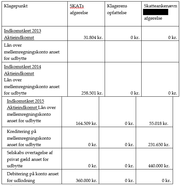 SKAT har anset klageren for skattepligtig af aktionærlån som udbytte med henholdsvis 31.804 kr., 258.501 kr. og 164.509 kr. for indkomstårene 2013-2015. Derudover har SKAT anset klageren for skattepligtig af udlodning med 360.000 kr. i 2015.