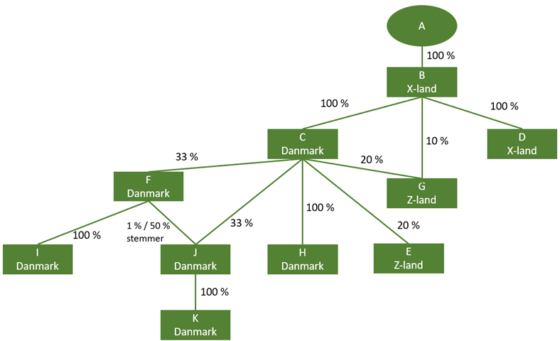 A har i en længere årrække været i gang med at etablere en international koncern, da A har et ønske om at drive forretning flere steder i EU og evt. udenfor EU. Topholdingselskabet B, er beliggende i X-land, og siden 20XX er alle investeringsforetagender foretaget derfra.