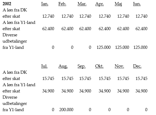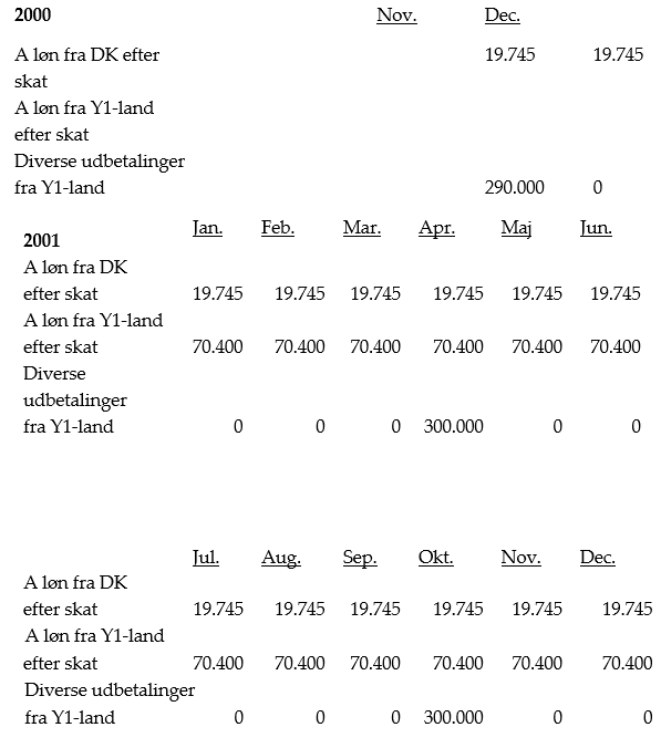 Efter opholdet i Y1-land (november 2000) vil den månedlige faste indtægt efter skat ligge på ca. kr. 38-42.000."